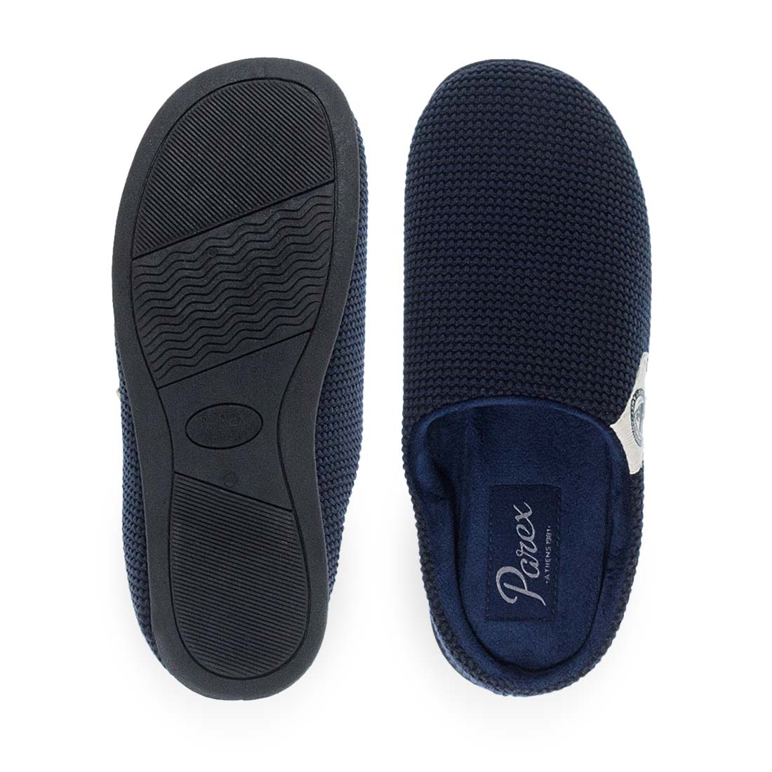 Ανδρικές παντόφλες σπιτιού Parex με πλεκτό σχέδιο . Είναι κατασκευασμένες από ύφασμα και διαθέτουν βελουτέ εσωτερικό πάτο. Τέλεια στήριξη και εφαρμογή από αυτές τις επώνυμες παντόφλες σπιτιού Parex.
