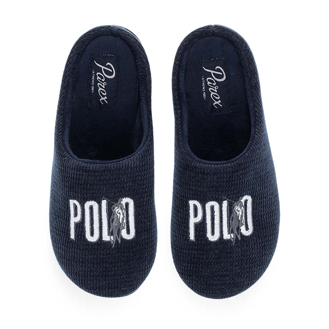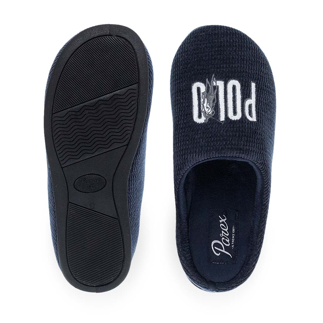 Ανδρικές παντόφλες Parex σε γκρι σκούρο και μπλε με κέντημα POLO. Κομψές, ζεστές και ανθεκτικές.