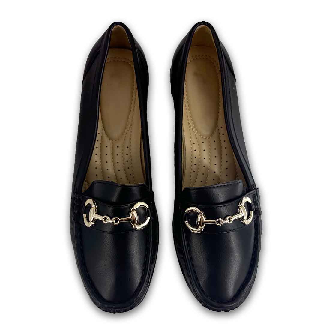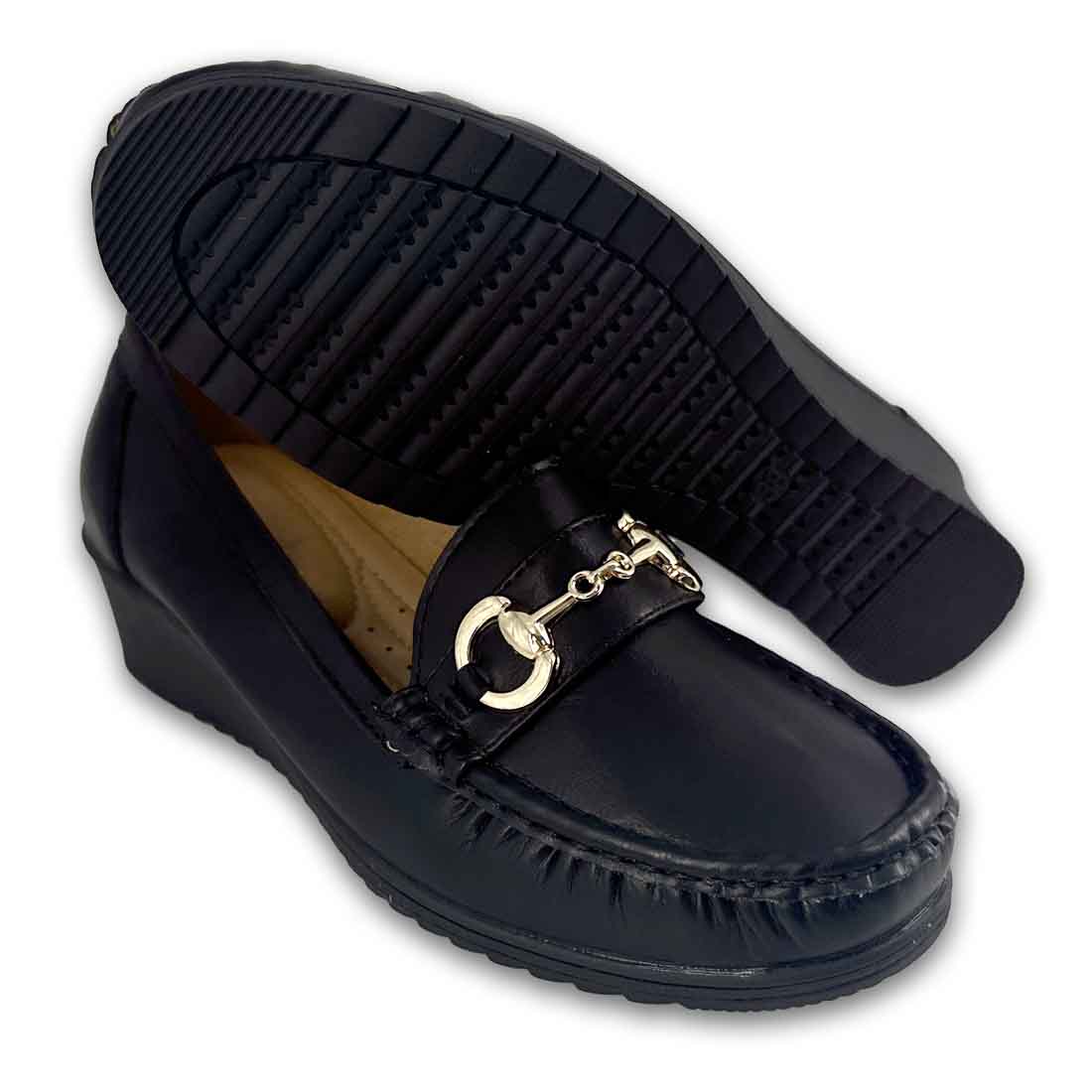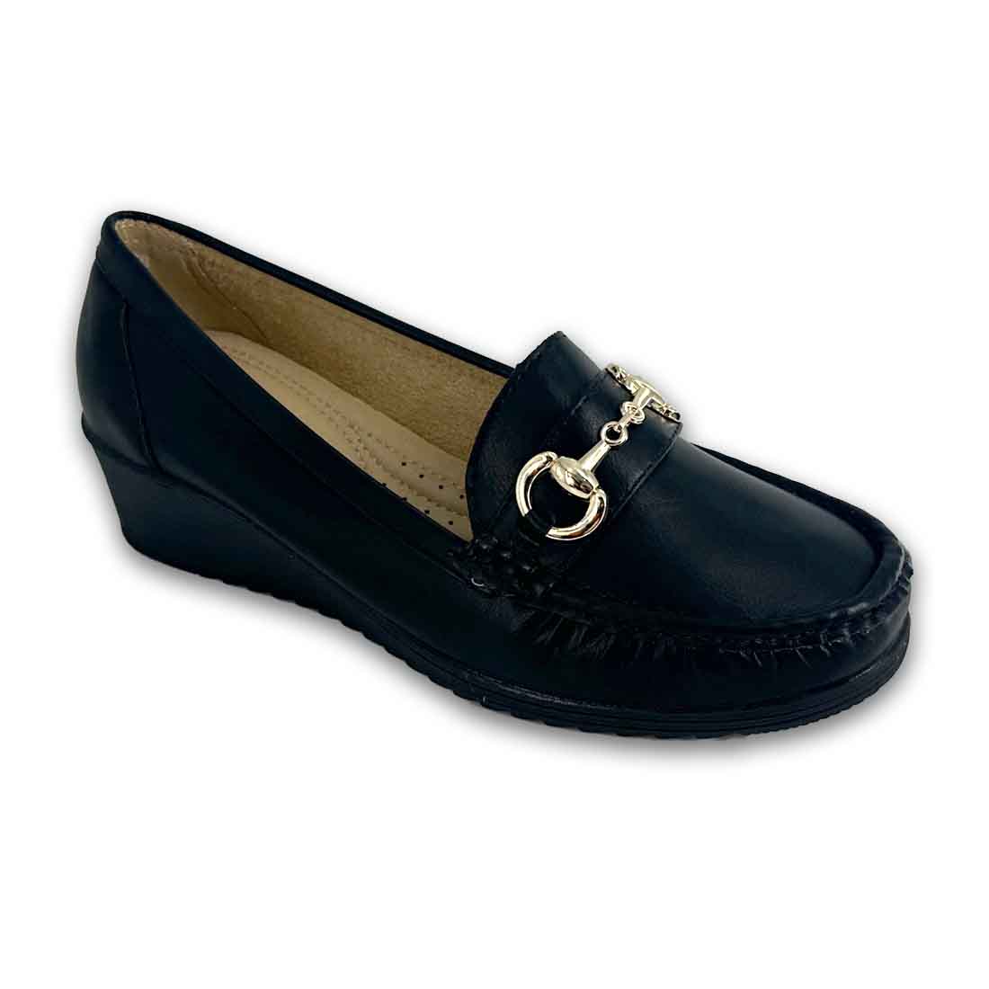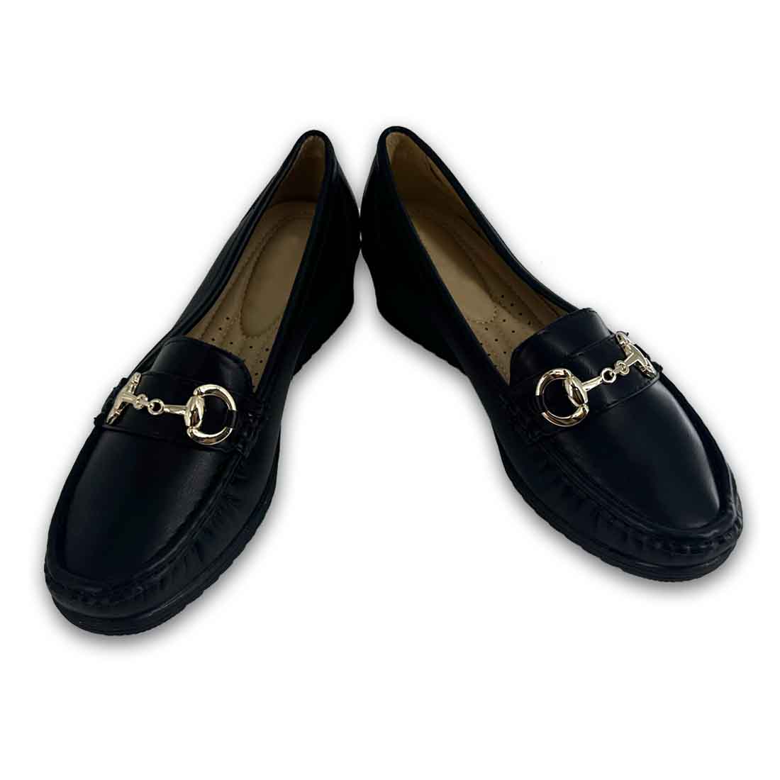Γυναικείο μοκασίνι με διακοσμητική αγκράφα και εξωτερικές ραφές περιμετρικά, διαθέτει τακούνι ιδανικό για άνεση όλη τη μέρα.