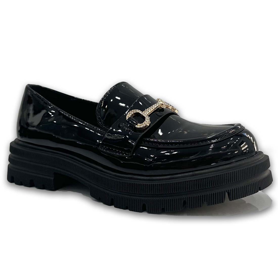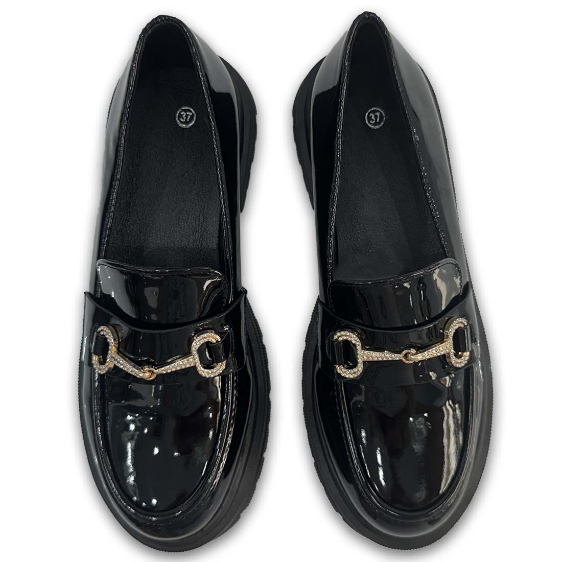 Γυναικεία μοκασίνια λουστρίνι που συνδυάζουν το κλασικό με το μοντέρνο, με διακοσμητική αλυσίδα με στρας και αντιολισθητική τρακτερωτή σόλα.