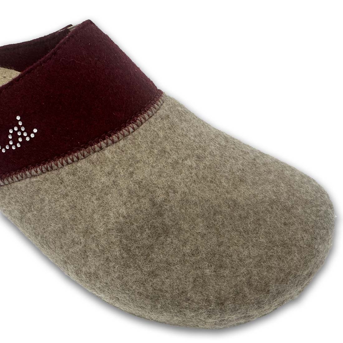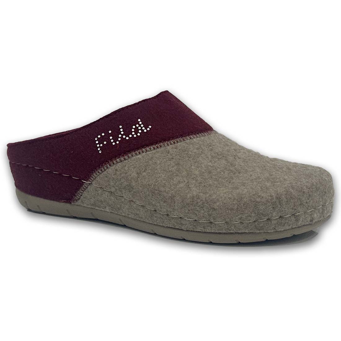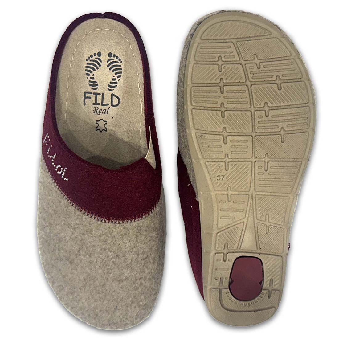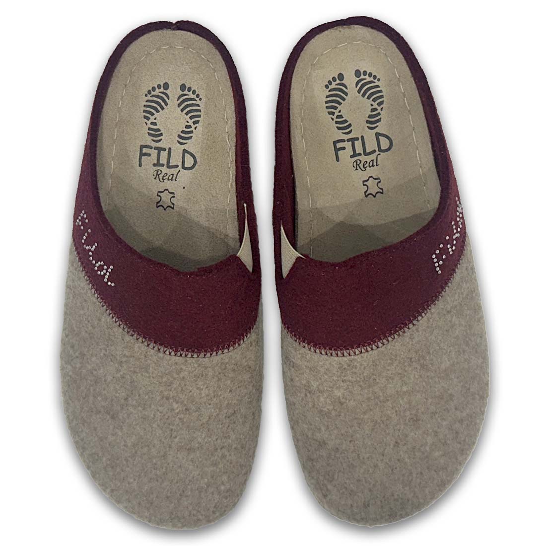 Γυναικείες χειμωνιάτικες παντόφλες σπιτιού της εταιρείας FILD, τσόχινες με σχέδιο από στρασάκια το λογότυπο, σε μπεζ και μπορντό χρώμα. Διαθέτουν ανατομικό σχεδιασμό για ξεκούραστο βάδισμα.