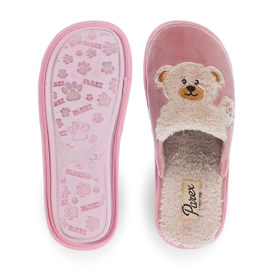 Γυναικείες παντόφλες Parex με σχέδιο αρκουδάκι στο πάνω μέρος της. Διαθέσιμες σε γκρι και σε ροζ χρώμα. Αναπαυτικές, ζεστές και άνετες για ξεκούραση κάθε μέρα, μια ιδανική επιλογή για το χειμώνα.