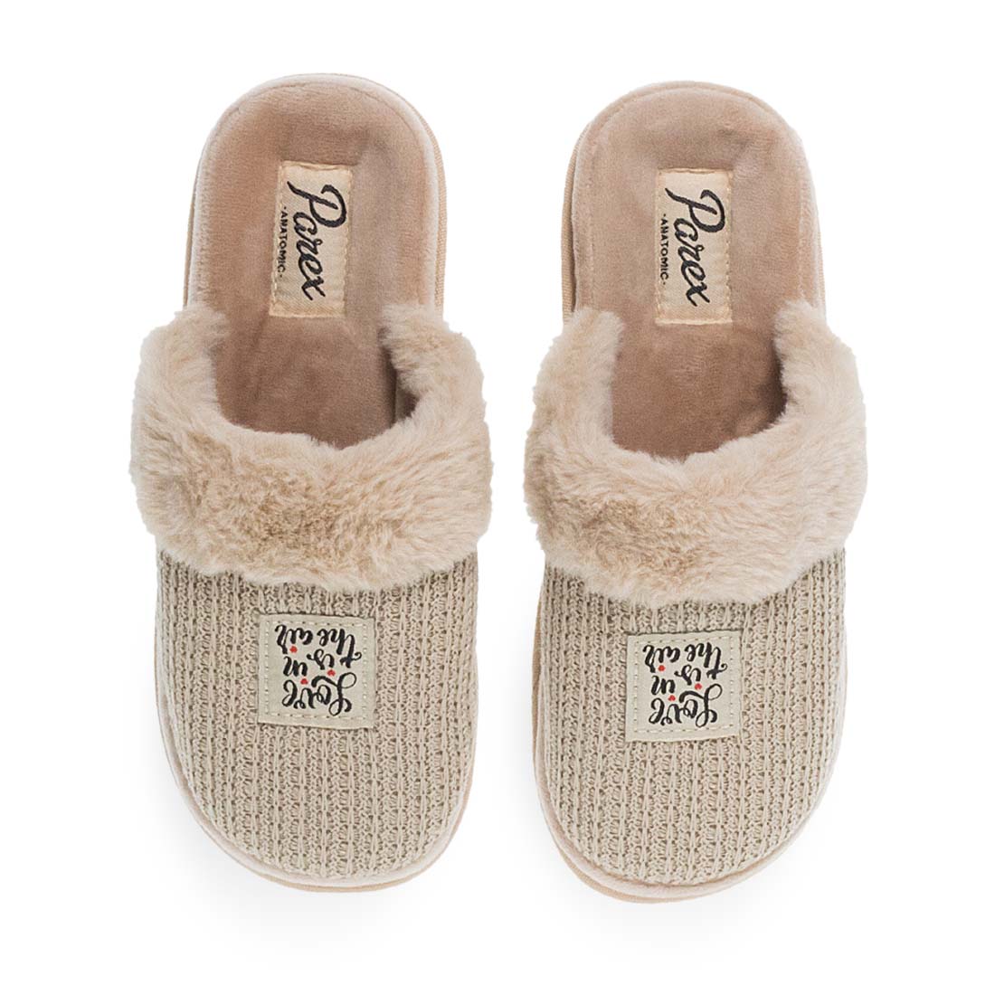 Υπέροχες παντόφλες σπιτιού Parex με πλεκτό σχέδιο και συνθετική γούνα. Διαθέτουν βελουτέ εσωτερικό πάτο, εξαιρετικά μαλακό. Διαχρονικές και ανθεκτικές για να προστατεύσουν τα κουρασμένα πόδια σας.