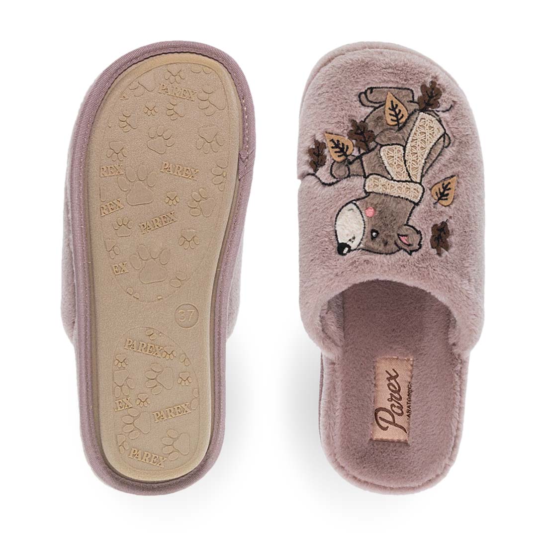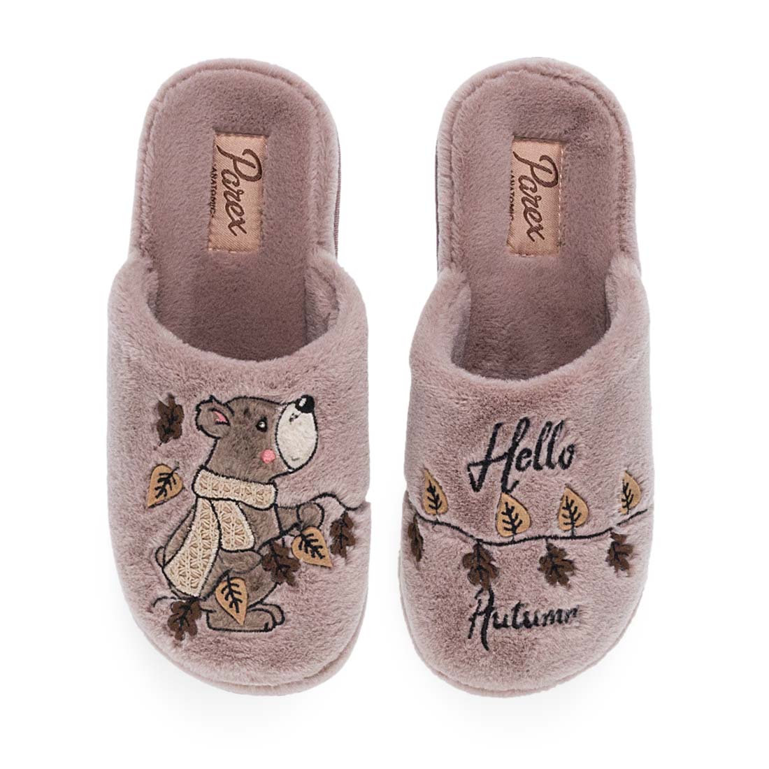 Γυναικείες παντόφλες σπιτιού Parex με παιχνιδιάρικο σχέδιο αρκουδάκι και το μήνυμα Hello Autumn. Διαθέσιμες σε μπεζ και πούρο, χαρίζουν απόλυτη απαλότητα και άνεση, κρατώντας τα πόδια ζεστά και χαρούμενα κάθε στιγμή.