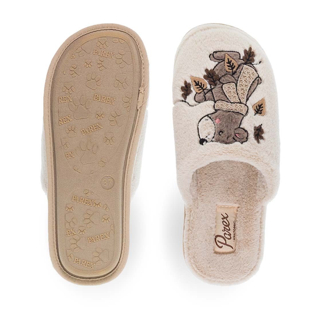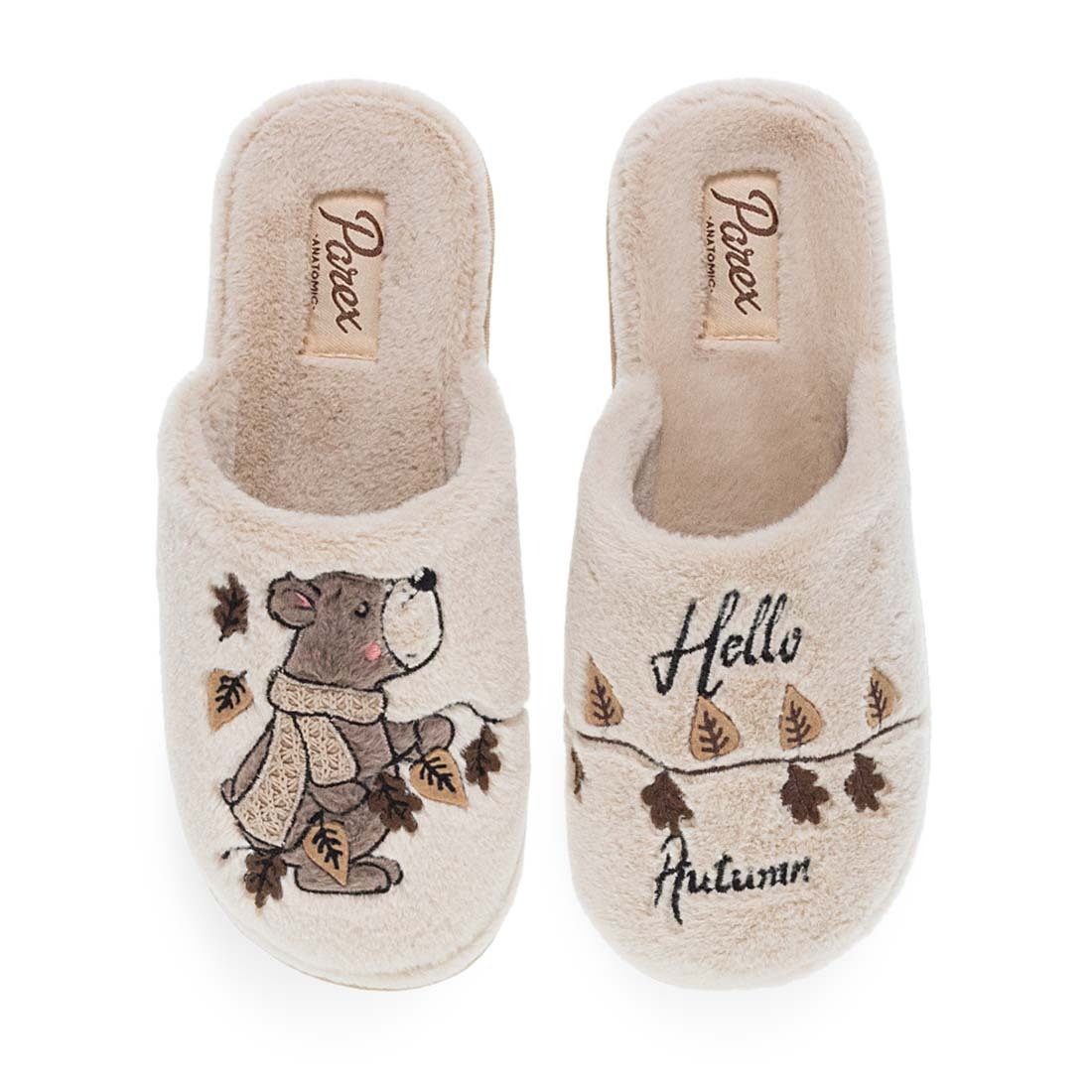 Γυναικείες παντόφλες σπιτιού Parex με παιχνιδιάρικο σχέδιο αρκουδάκι και το μήνυμα Hello Autumn. Διαθέσιμες σε μπεζ και πούρο, χαρίζουν απόλυτη απαλότητα και άνεση, κρατώντας τα πόδια ζεστά και χαρούμενα κάθε στιγμή.