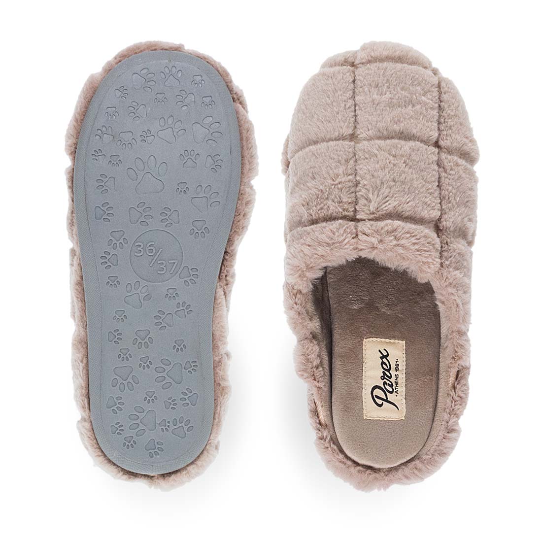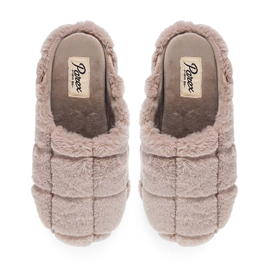 Γυναικείες παντόφλες σπιτιού Parex σε καφέ και μπεζ χρώμα, με ραφές που δημιουργούν διακριτικό καπιτονέ εφέ. Εξαιρετικά απαλές, με εσωτερική επένδυση που χαρίζει ζεστασιά και χαλαρή αίσθηση. Ένα ζευγάρι που συνδυάζει άνεση και minimal αισθητική.
