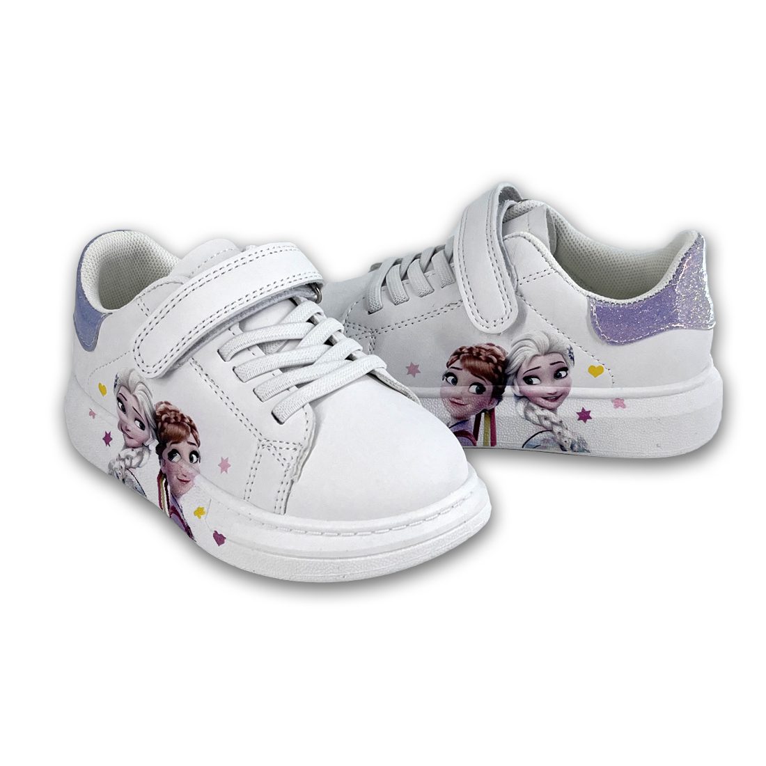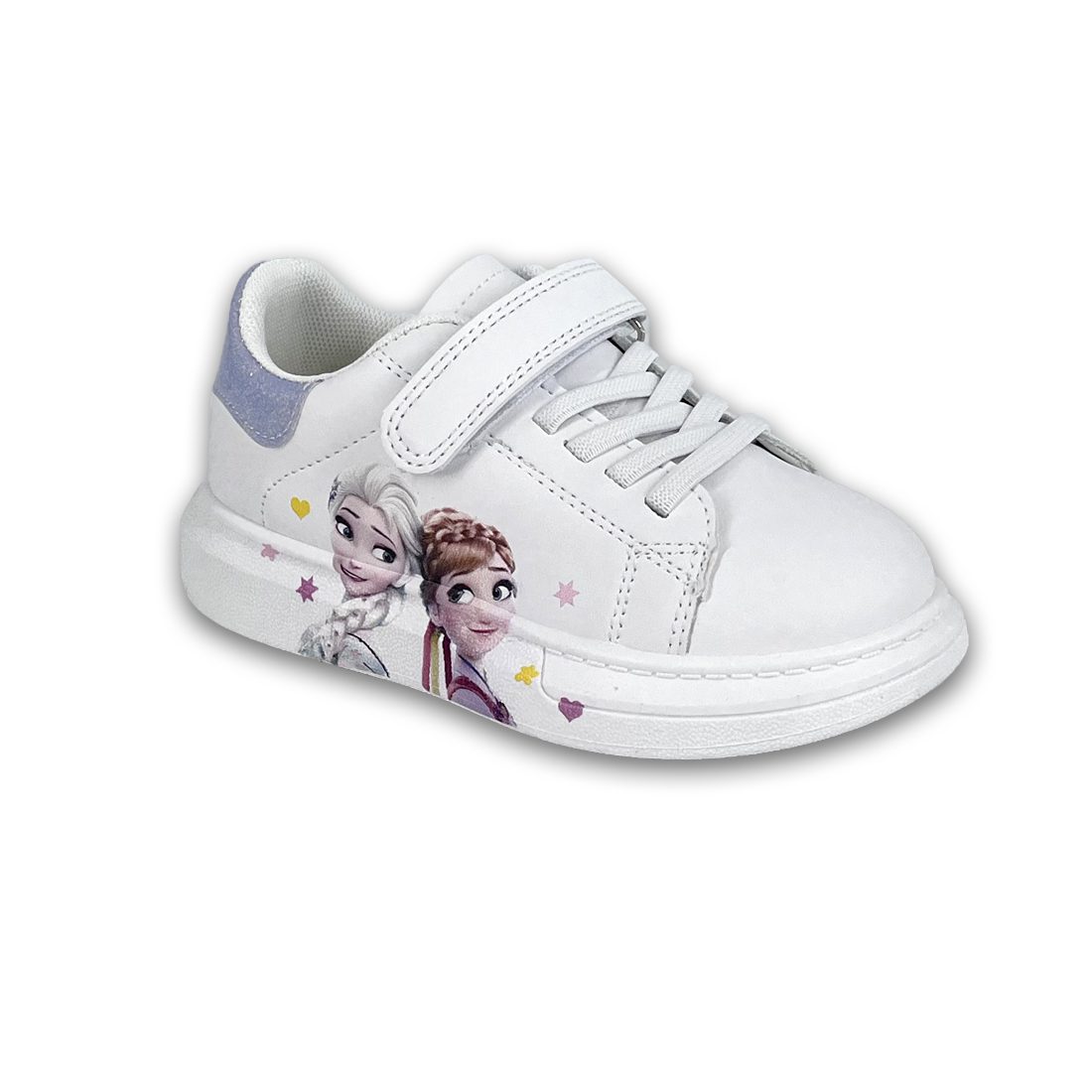 Παιδικό sneaker σε λευκό χρώμα και μωβ λεπτομέρεια στο πίσω μέρος με σχέδιο Frozen στην εξωτερική πλευρά. Διαθέτει velcro και κορδόνια από ελαστικό ύφασμα για εύκολη εφαρμογή.