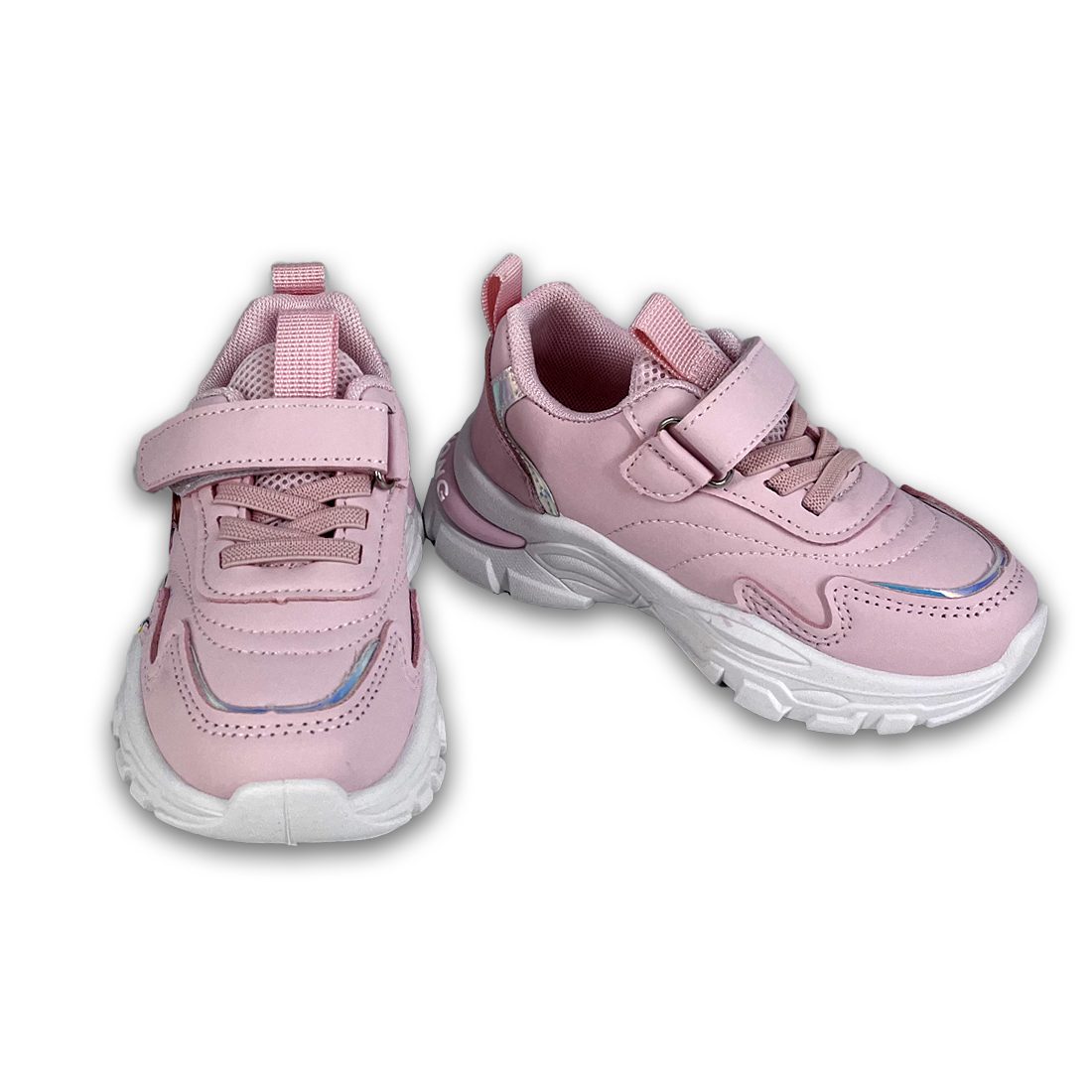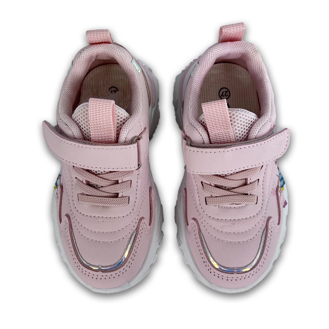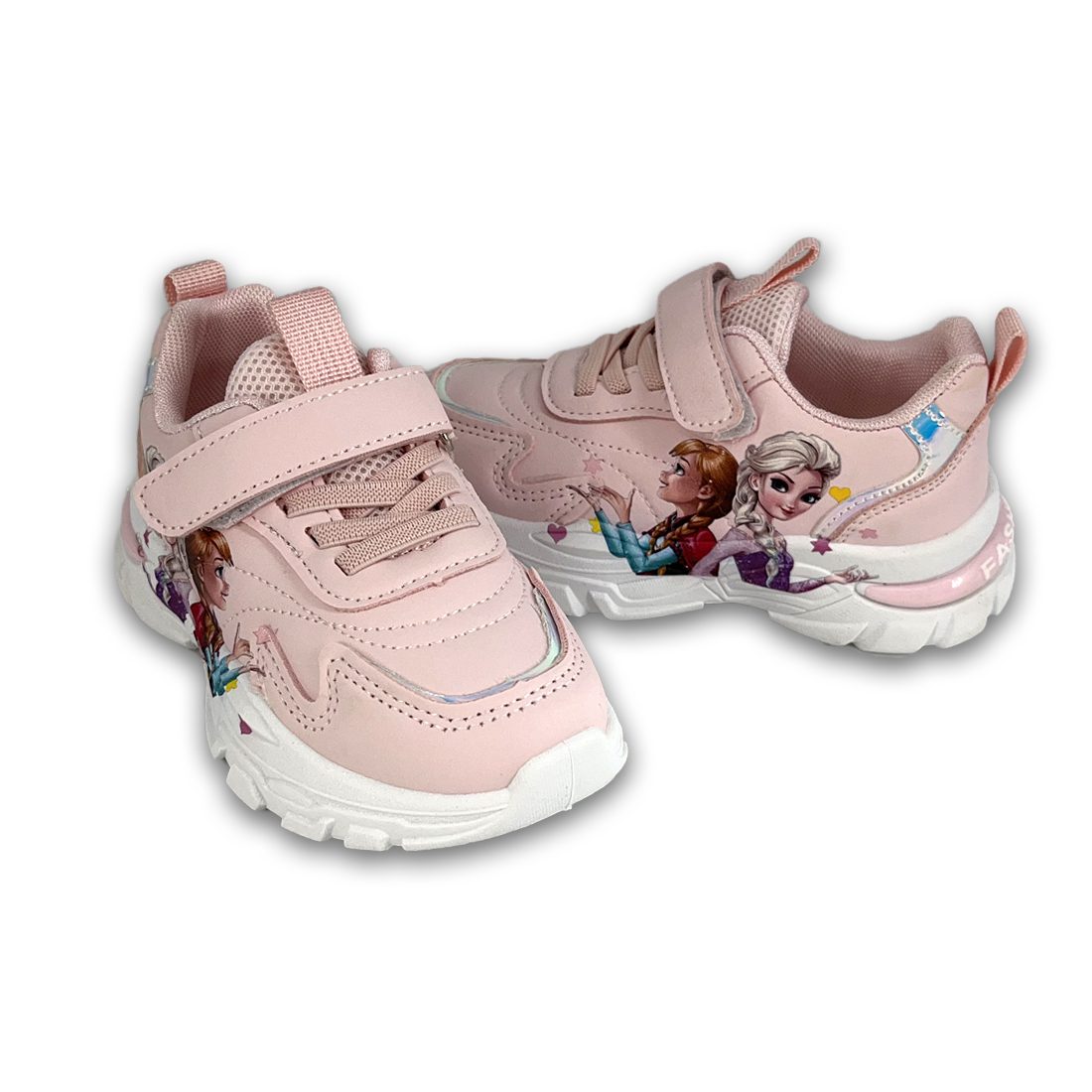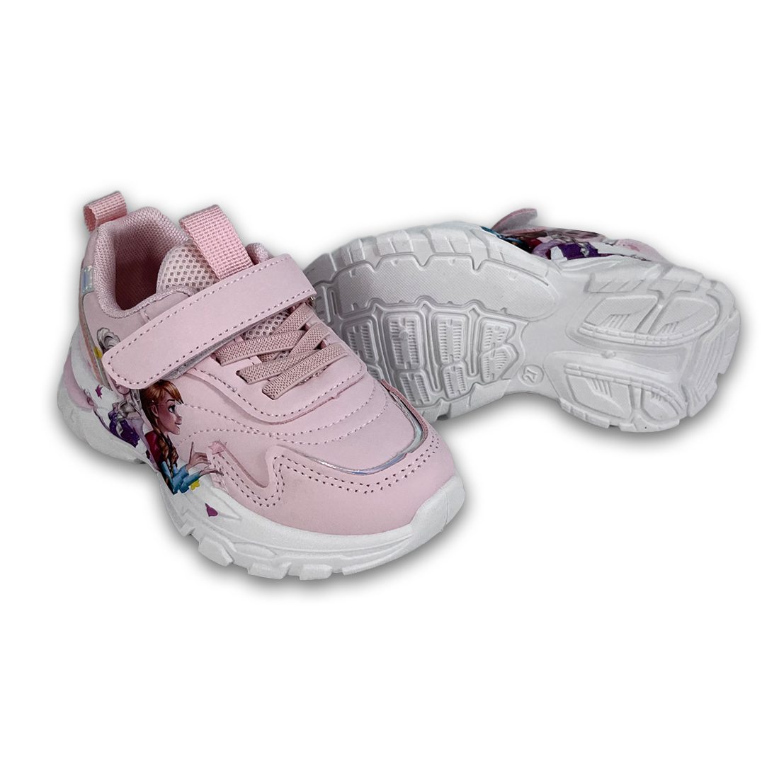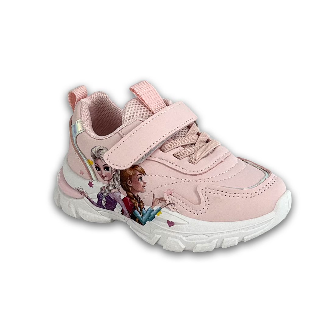 Παιδικό sneaker σε λευκό χρώμα και ιριδίζον λεπτομέρειες, με σχέδιο Frozen στην εξωτερική πλευρά. Διαθέτει velcro και κορδόνια από ελαστικό ύφασμα για εύκολη εφαρμογή.
