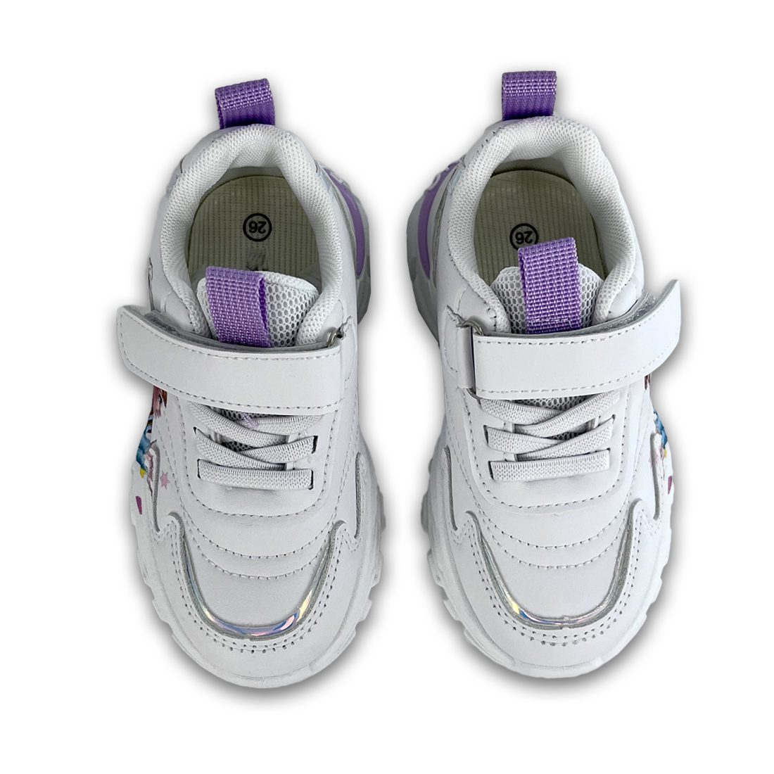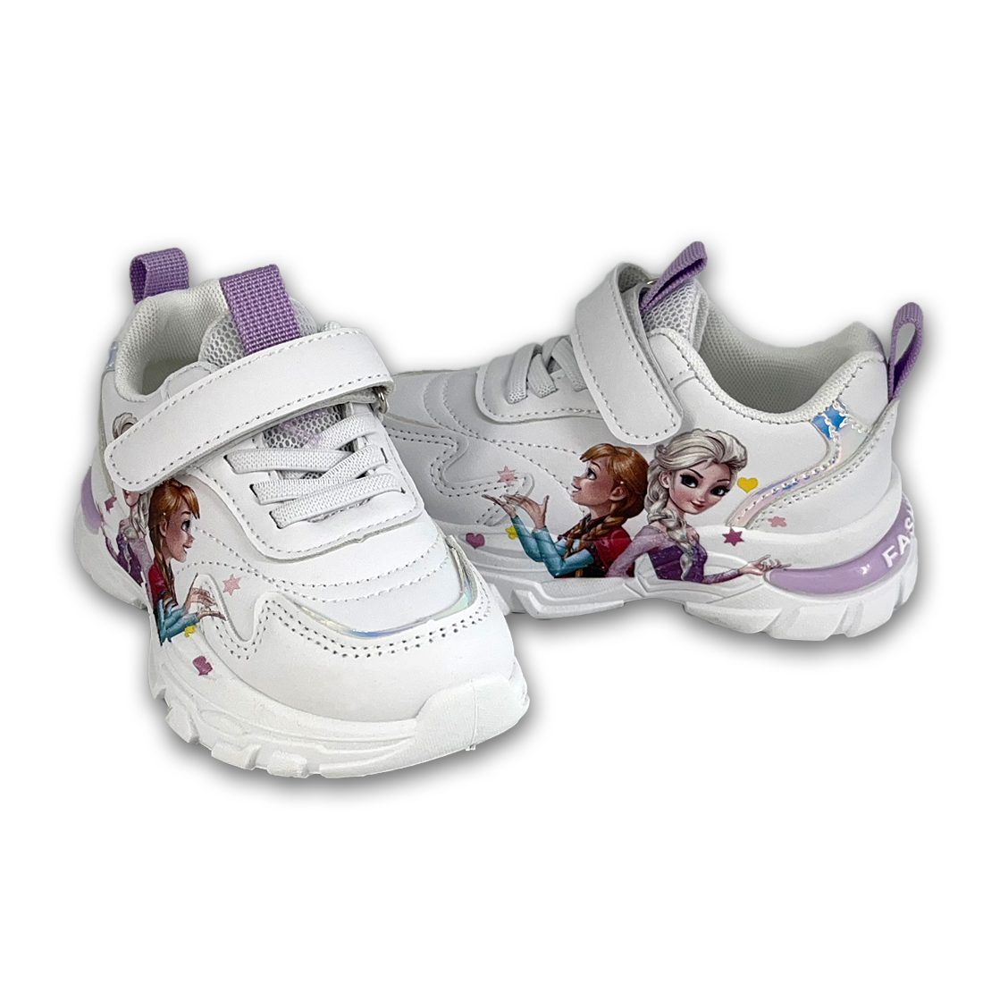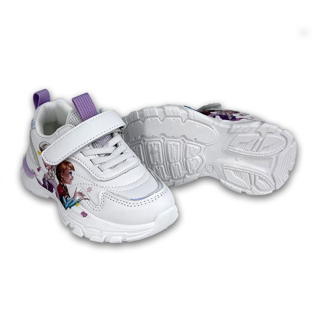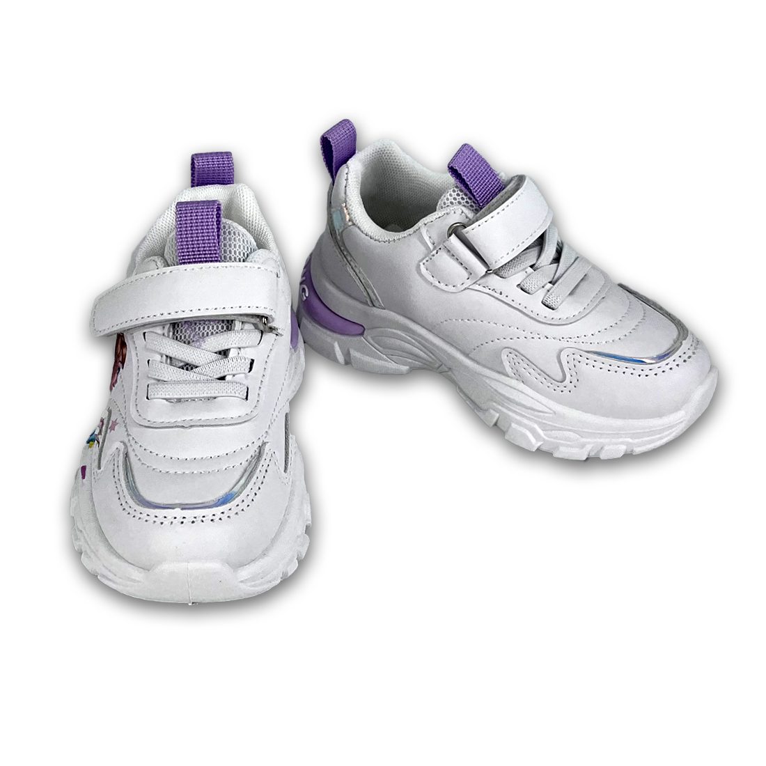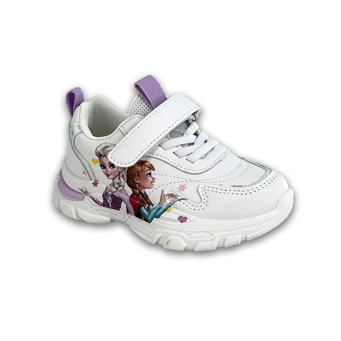 Παιδικό sneaker σε λευκό χρώμα και μωβ λεπτομέρειες, με σχέδιο Frozen στην εξωτερική πλευρά. Διαθέτει velcro και κορδόνια από ελαστικό ύφασμα για εύκολη εφαρμογή.