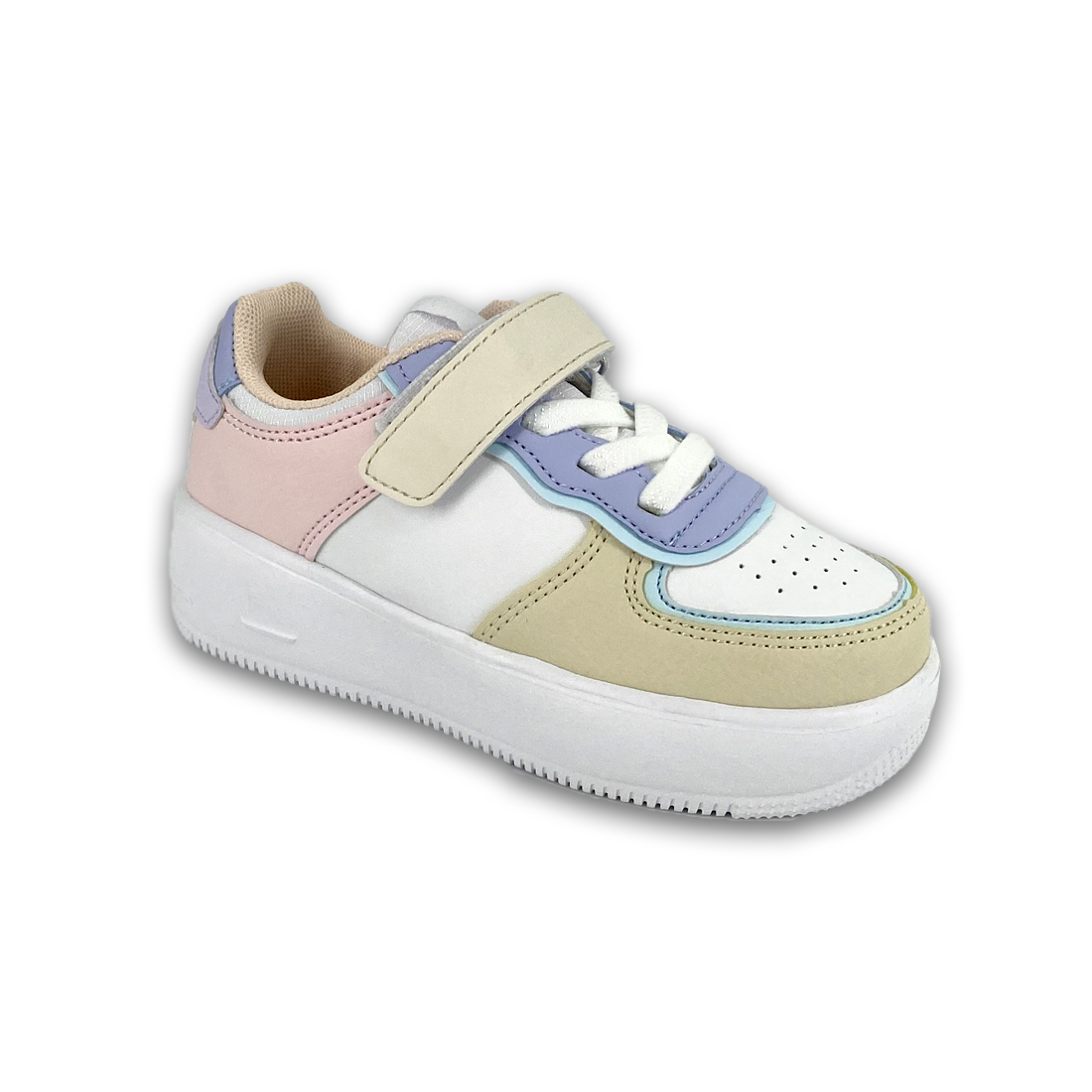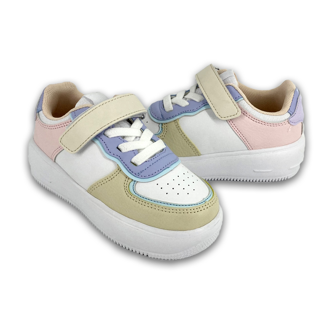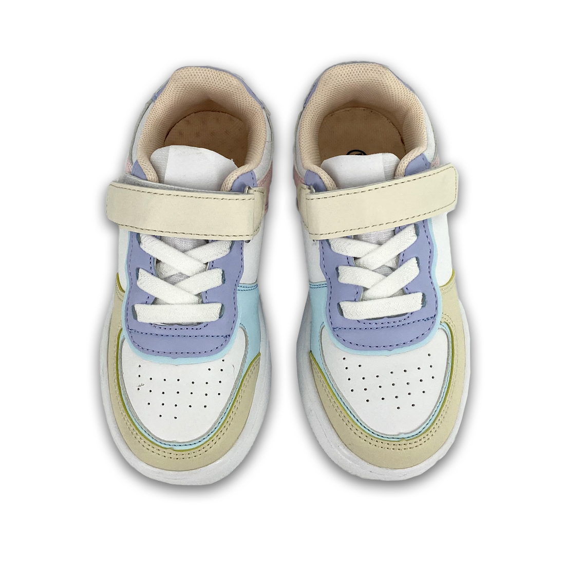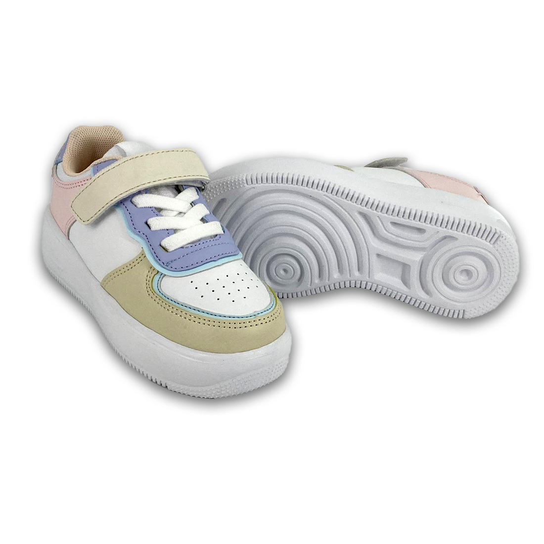 Παιδικό sneaker σε συνδυασμό παστέλ χρωμάτων με αυτοκόλλητο και κορδόνια από ελαστικό ύφασμα για εύκολη εφαρμογή.