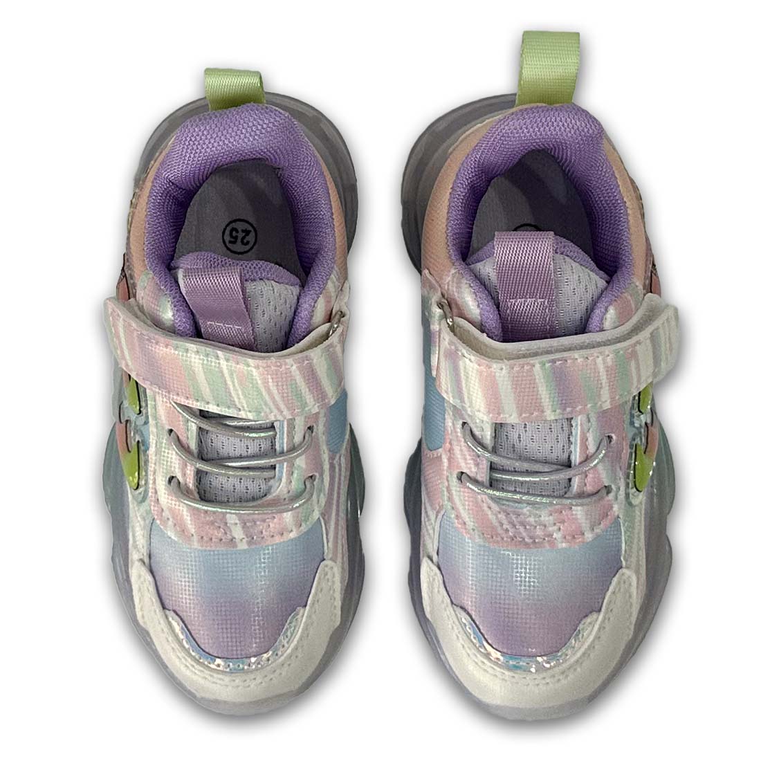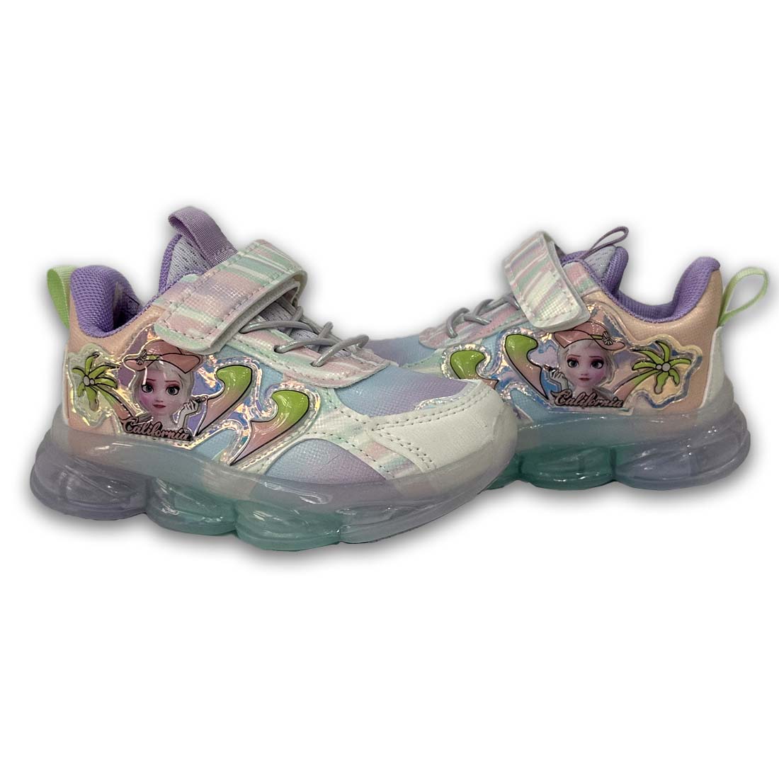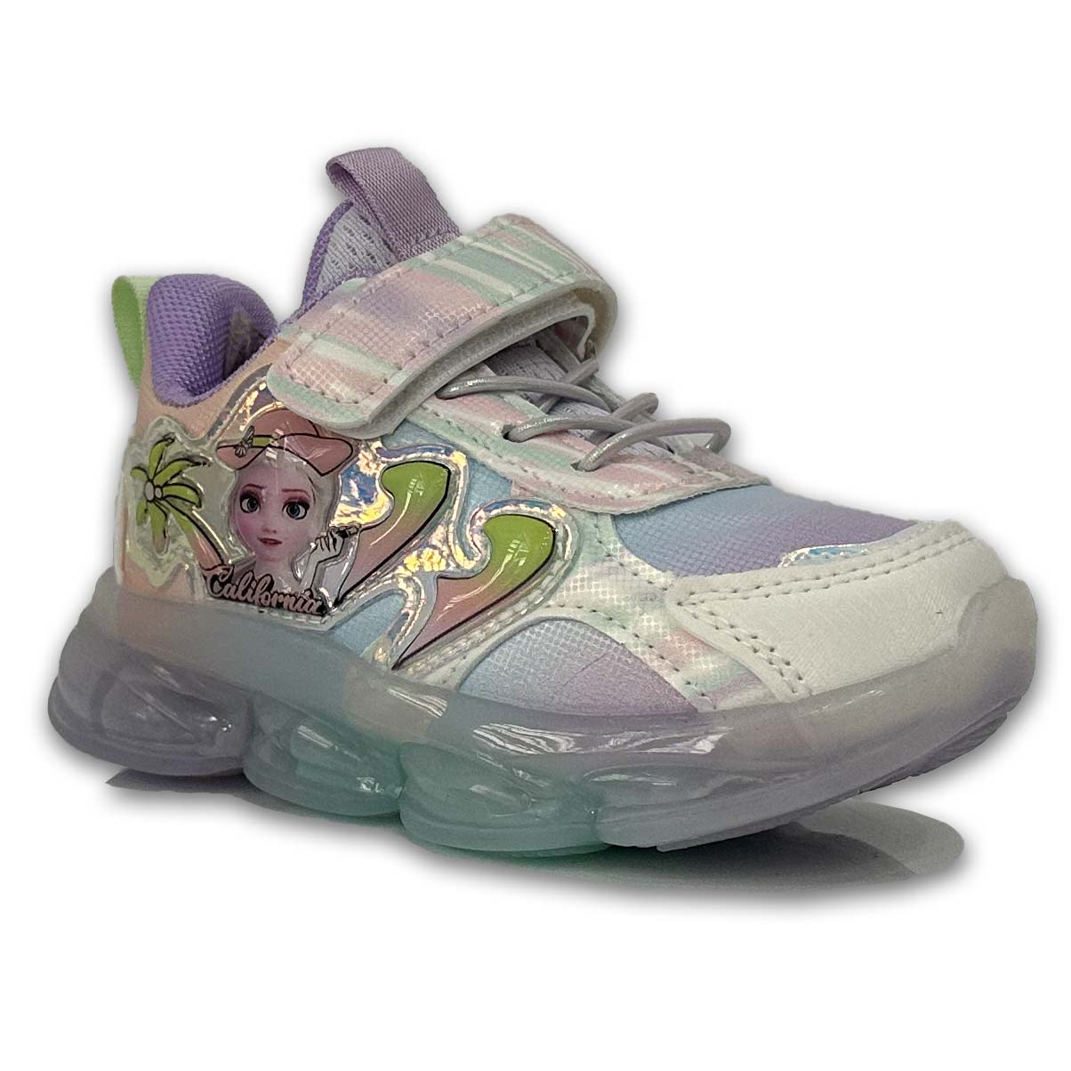 Παιδικό sneaker με φωτάκια σε ροζ χρώμα και ιριδίζον λεπτομέρειες, με σχέδιο πριγκίπισσα στην εξωτερική πλευρά. Διαθέτει velcro και κορδόνια από ελαστικό ύφασμα για εύκολη εφαρμογή.