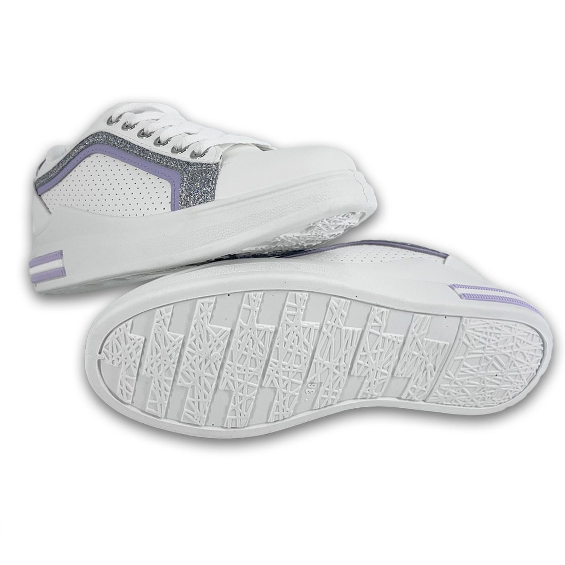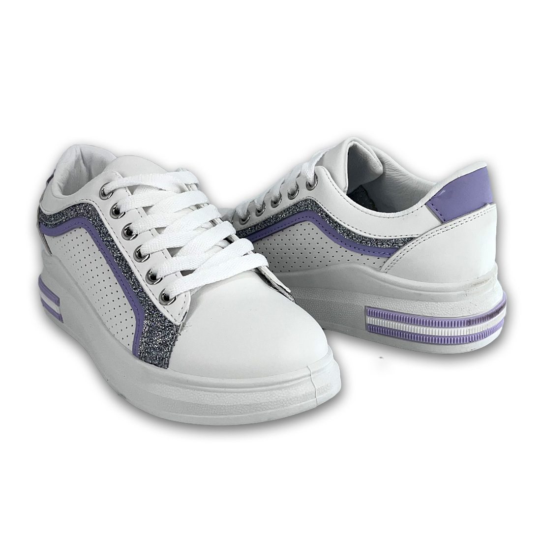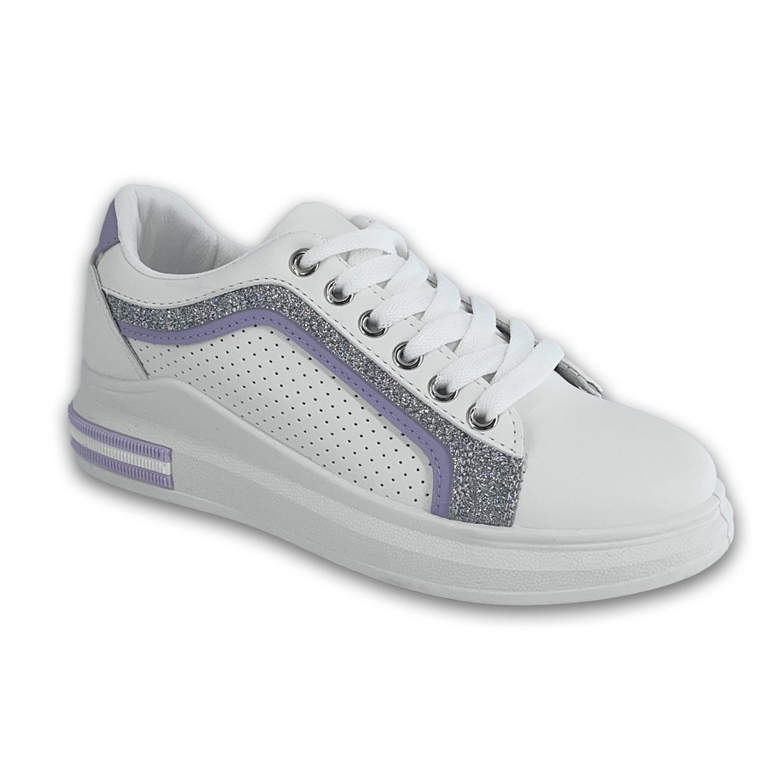 Γυναικείο sneaker με ψηλή σόλα με σχέδιο από glitter στις πλαϊνές πλευρές και λιλά λεπτομέρειες.