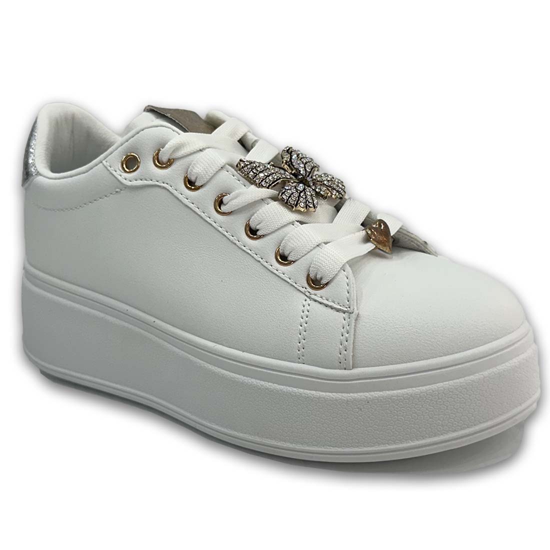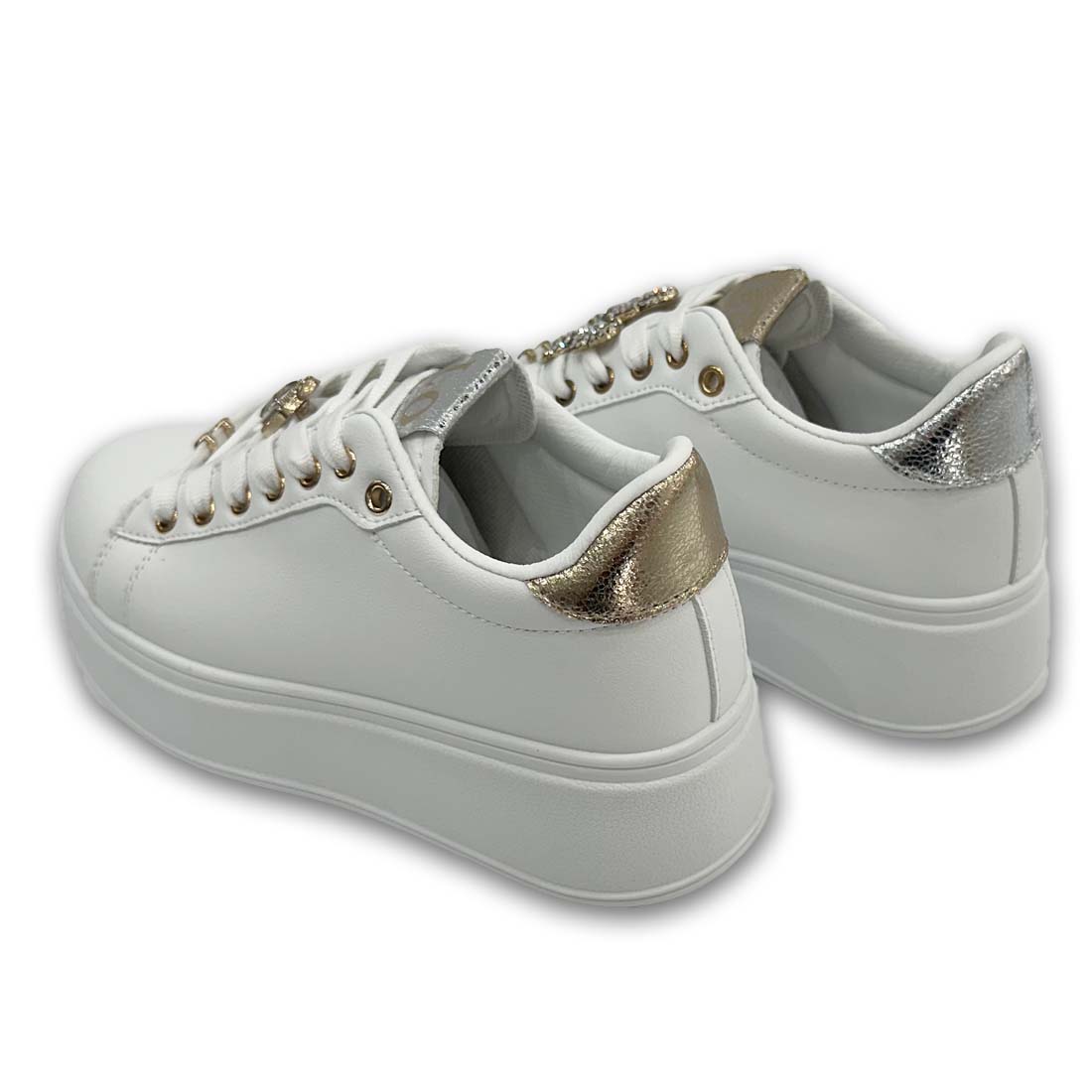 Γυναικείο sneaker με ασημί και χρυσές λεπτομέρειες διαφορετικές στο κάθε πόδι. Διαθέτει διακοσμητικά στρας σε σχέδια στο κορδόνι που μπορείτε να αφαιρέσετε και να προσθέσετε ανάλογα με τις προτιμήσεις σας.