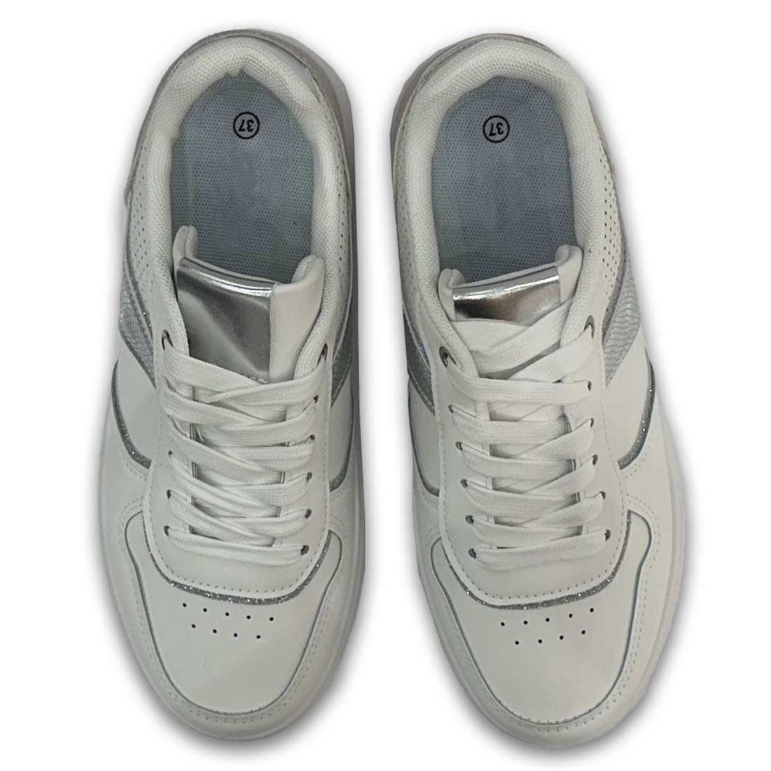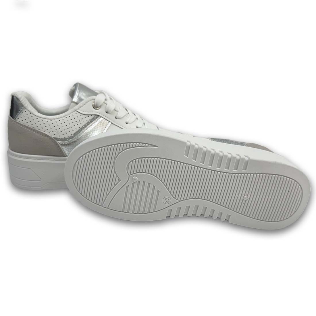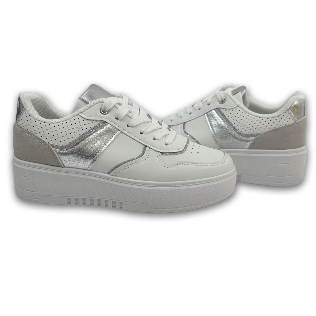 Γυναικείο sneaker με ψηλή σόλα σε συνδυασμό χρωμάτων και υλικών με ασημί glitter λεπτομέρειες.