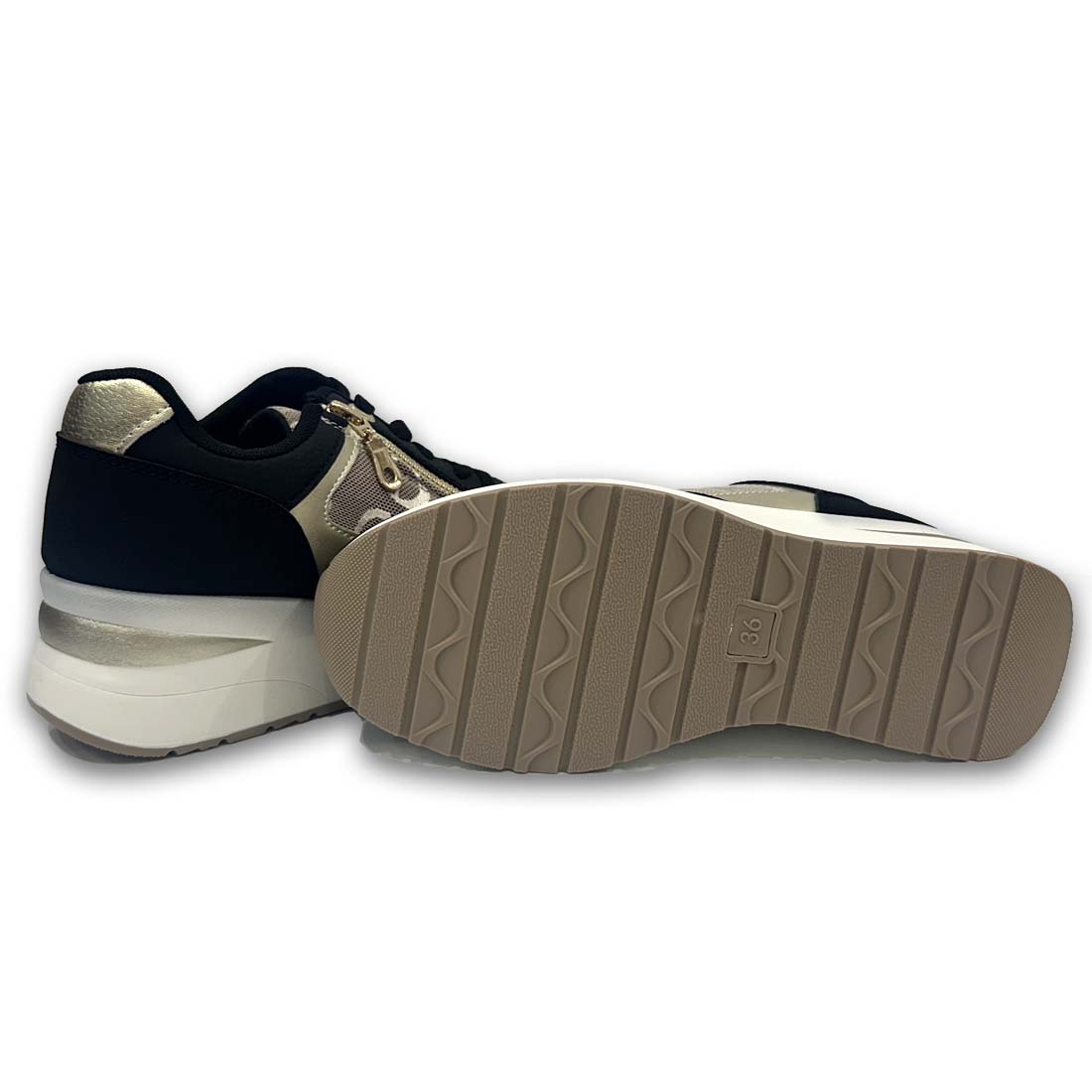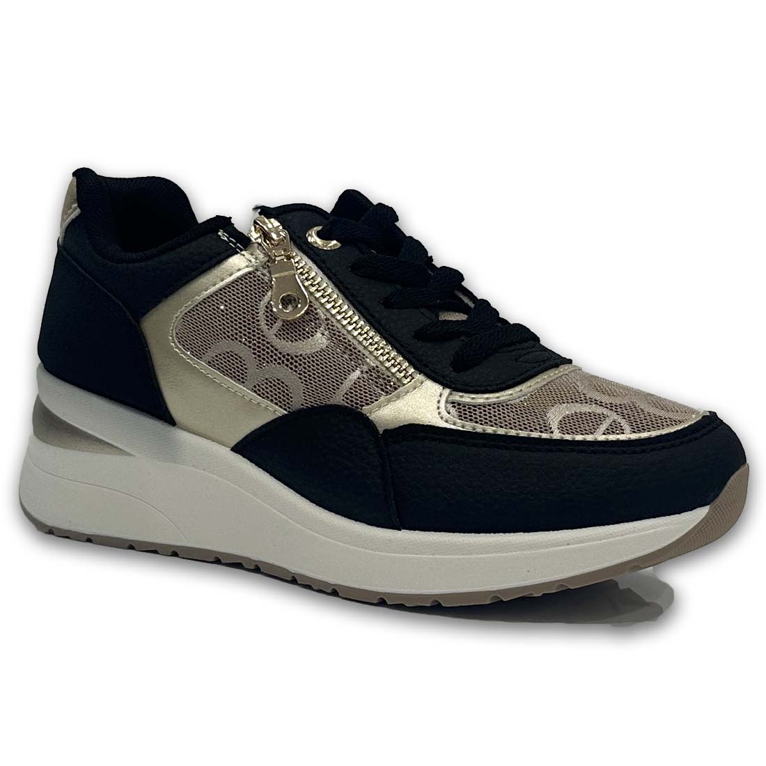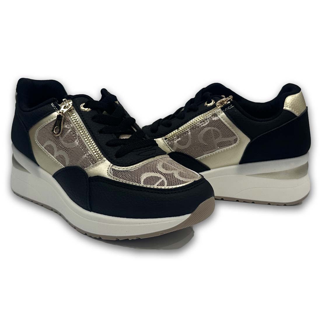 Γυναικείο sneaker με τακούνι σε παστέλ συνδυασμό χρωμάτων. Διαθέτει λειτουργικό φερμουάρ στο πλαϊνό μέρος με χρυσές λεπτομέρειες. Ελαφρύ και κομψό, ιδανικό για όλες τις ώρες της ημέρας.
