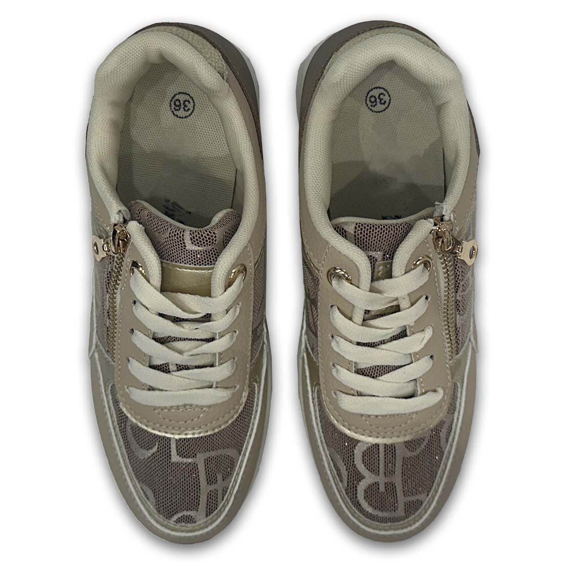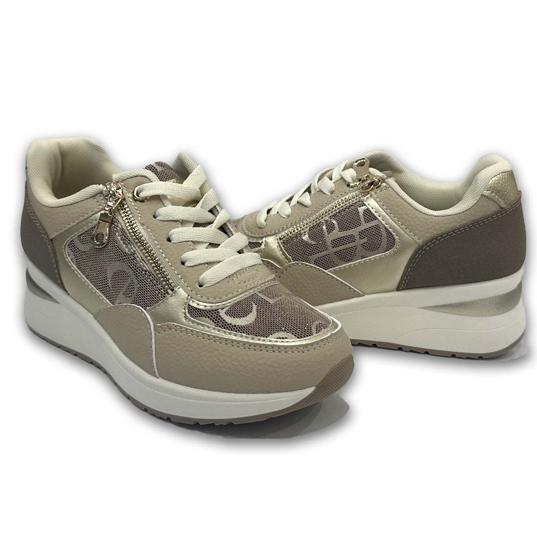 Γυναικείο sneaker με τακούνι σε παστέλ συνδυασμό χρωμάτων. Διαθέτει λειτουργικό φερμουάρ στο πλαϊνό μέρος με χρυσές λεπτομέρειες. Ελαφρύ και κομψό, ιδανικό για όλες τις ώρες της ημέρας.